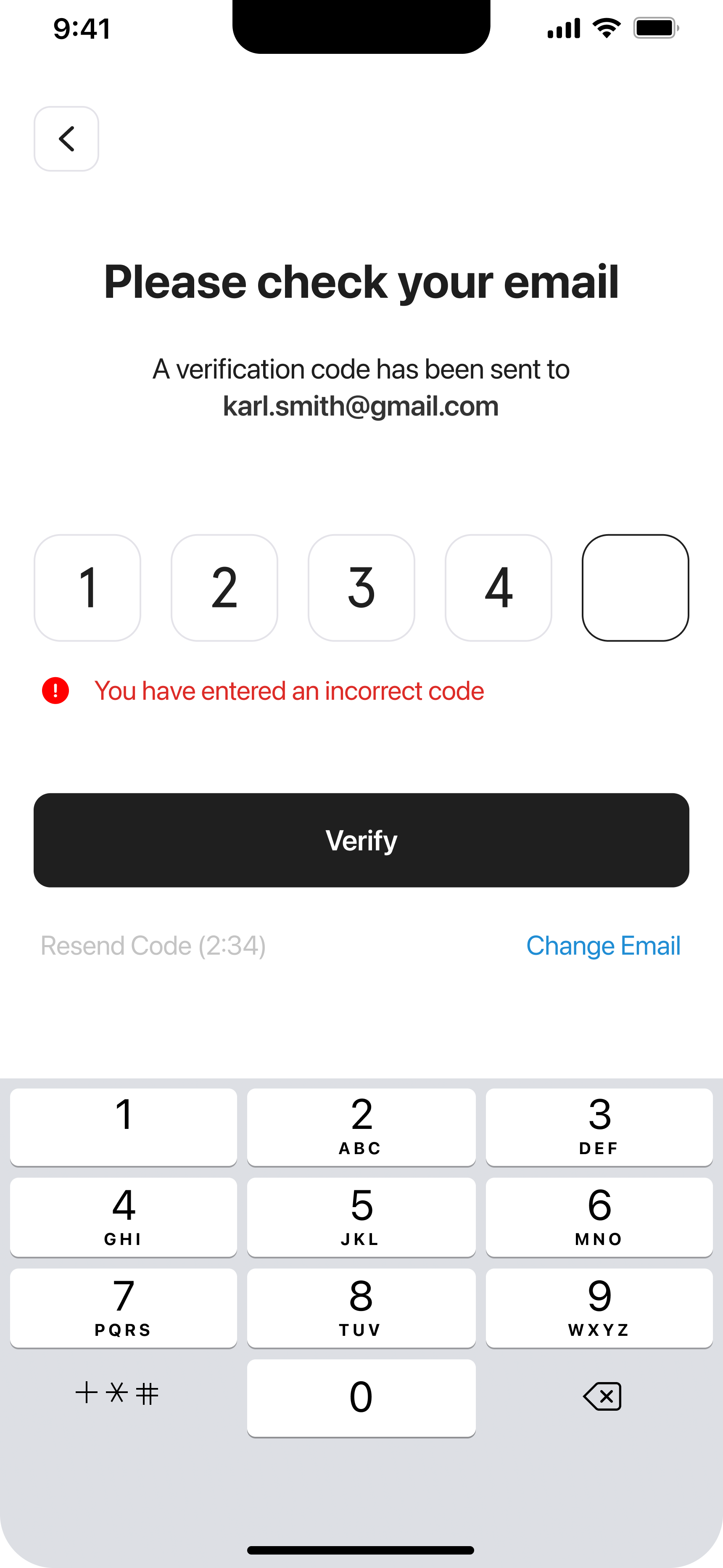 Check your spam or junk folder first. If you still don't see it, tap "Resend Code" to get a new verification email. You can also tap "Change Email" if you entered the wrong address.